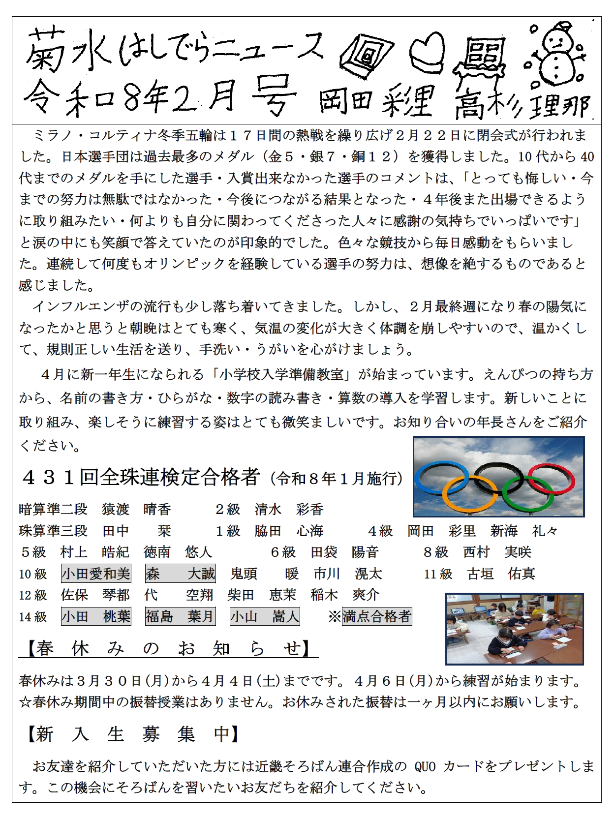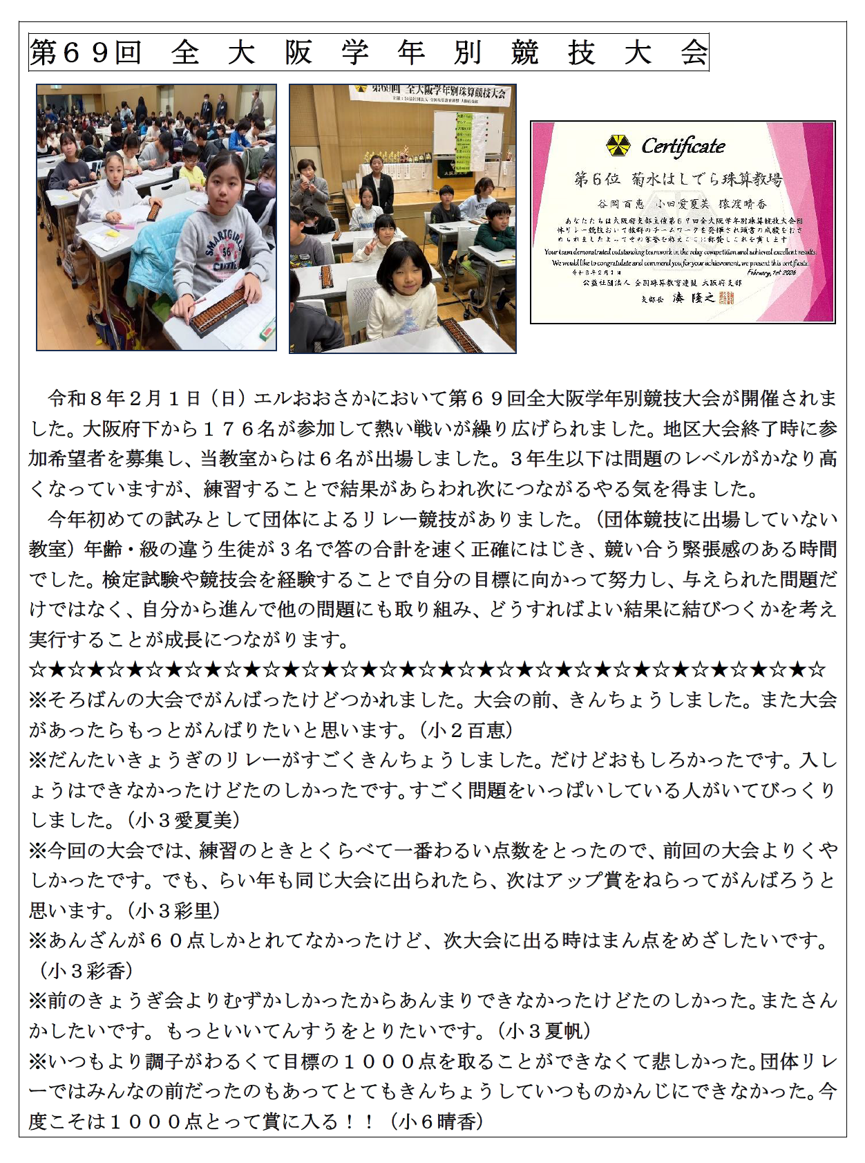 Let’s Try Soroban & Anzan! Hashidera 公益社団法人 全国珠算教育連盟 正会員指導教場全国珠算教育連盟 大阪府支部近畿そろばん連合全国書写書道教育連盟 菊水はしでら珠算教場はしでら書写教室 住 所大阪市旭区太子橋3-12-7 最寄駅大阪市営地下鉄谷町線:守口駅 通 学駐車場:近隣にあり、自転車置き場:あり