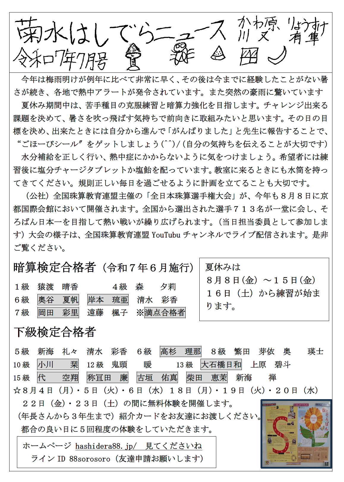 Let’s Try Soroban & Anzan! Hashidera 公益社団法人 全国珠算教育連盟 正会員指導教場全国珠算教育連盟 大阪府支部近畿そろばん連合全国書写書道教育連盟 菊水はしでら珠算教場はしでら書写教室 住 所大阪市旭区太子橋3-12-7 最寄駅大阪市営地下鉄谷町線:守口駅 通 学駐車場:近隣にあり、自転車置き場:あり